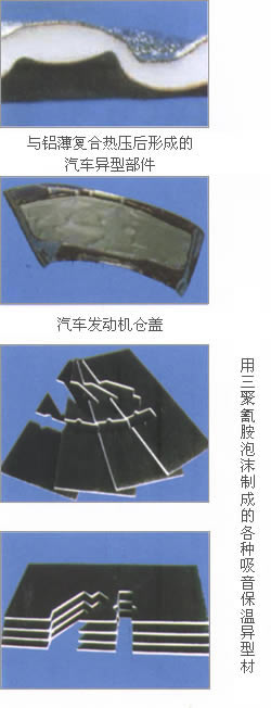 壓層的吸音裝置非常適合在汽車引擎罩下側、車身端壁前面的蓋子和傳動管道的安裝。因為以Greencos綠寰宇多型號吸聲隔熱泡綿板為內核的零件相比其他吸音材料可以輸出相對較高的抗彎強度,實現對連接件磨損的減少。由于其卓越的復合特性,Greencos綠寰宇多型號吸聲隔熱泡綿板也被用于引擎室的消音用途,比如由Greencos綠寰宇三聚氰胺泡沫塑料與鋁箔復合制作的隔熱消聲板。